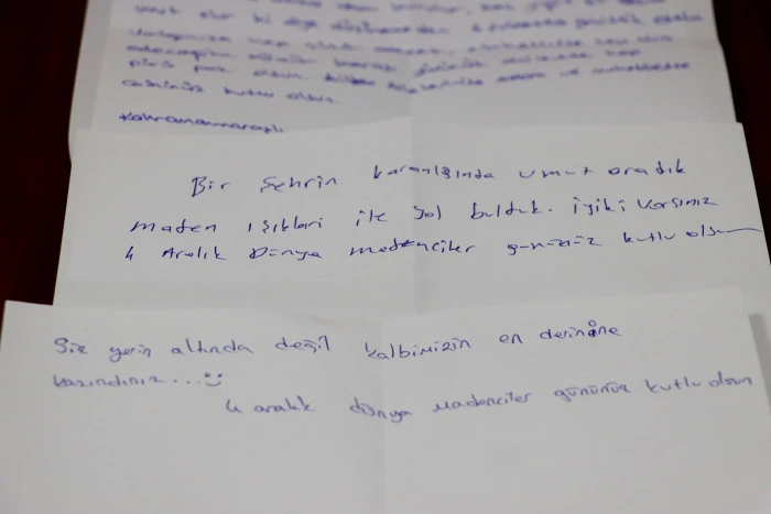 Kahramanmaraş Büyükşehir Belediyesi’nin kent meydanında kurduğu stantta, vatandaşlar, depremzedeler, gaziler ve öğrencilerin duygularını paylaştığı mektuplar, kargo ile Genel Maden İşçileri Sendikası’na gönderildi. Mektuplarda 4 Aralık Dünya Madenciler Günü kutlamasının yanı sıra teşekkür ve minnet dolu ifadeler kullanıldı.