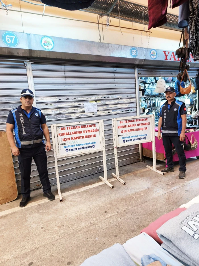 Kdz. Ereğli Belediyesi Zabıta Müdürlüğü ekipleri gelen şikayetler üzerine pazar yerinde müşteriye kaba davranan 2 tezgaha cezai işlem uygulayarak 1 hafta süreyle kapattı.